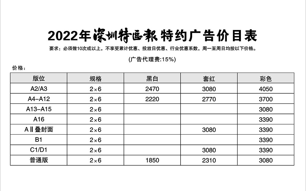 深圳特區(qū)報特約廣告價目表