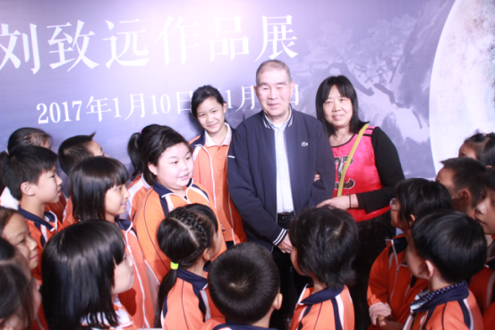 展覽現(xiàn)場,高勵節(jié)與以其父親名字命名的“劍父小學(xué)”學(xué)生們合影