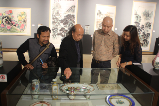 劉致遠作為國畫、廣彩陶藝大師劉群興之子,也自幼隨父學(xué)習(xí)國畫及陶瓷制作,其廣彩作品色澤鮮明,絢麗多彩,既師吸收統(tǒng)繪畫技法,又仿造西洋畫法,頗具嶺南畫派折衷中西的精髓。其國畫松樹題材的創(chuàng)作,盡顯崇山峻嶺之中,松之勁峭與水之嫵媚,其繪制的山水題材彩瓷既有山河磅礴之態(tài)勢、又具匠心細刻之精致。此次兩位嶺南畫派傳承人在此展出他們的作品,內(nèi)容、風(fēng)格各異,交相輝映,很好地承傳了嶺南畫派的要義。