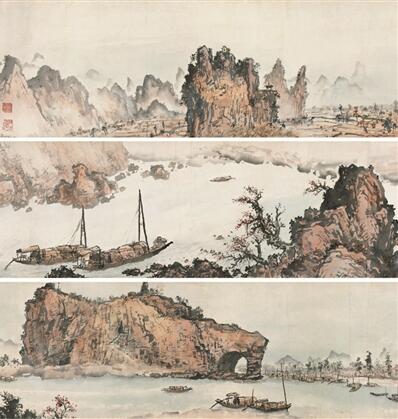 關(guān)山月白天外出寫(xiě)生,晚上整理寫(xiě)生畫(huà)稿,獲得了一大批寫(xiě)生作品。秀美的桂林山水激發(fā)了他的創(chuàng)作熱情,引發(fā)了他的創(chuàng)作靈感,他覺(jué)得應(yīng)該進(jìn)行大的創(chuàng)作,把百里漓江兩岸勝景盡收畫(huà)卷之中。但是,他所住的七星巖公寓,又小又暗,只有一張小桌子,施展不開(kāi)。而且,他還欠了一大筆租金,住不下去了。幸好得到李焰生的幫助,住進(jìn)其家,得以在李家的客廳里作畫(huà),桌子不夠?qū)?,他就把紙鋪在地板上蹲、趴著?huà)。奮戰(zhàn)了月余,終于完成了一幅32.8厘米×2850厘米的長(zhǎng)卷《漓江百里圖》,開(kāi)創(chuàng)了廣西的“漓江畫(huà)派”風(fēng)格。