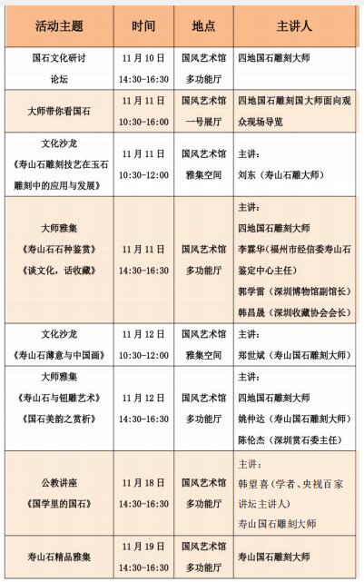 不僅如此,來自四地的國家級、省級工藝美術大師、非物質文化遺產傳人將親臨深圳, 展覽期間,舉辦名家對話論壇,開設兩場名石雕刻藝術公開講座,另逢周末將特邀兩位國石大師在現場為觀眾導賞。