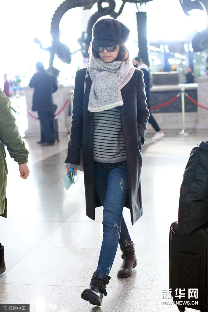 ??? 北京,近日,林心如現(xiàn)身首都機場。 林心如頭戴灰色毛呢報童帽,黑色太陽鏡遮面,身穿黑色毛呢修身毛呢大衣外套,脖帶淺灰色針織圍脖,內(nèi)搭條紋T恤,肩背白色Herems凱莉包,下穿深藍(lán)色磨白緊身牛仔褲,腳穿鉚釘平底踝靴。