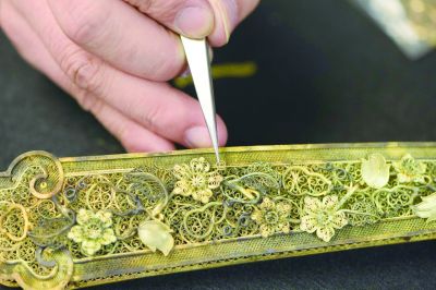 經(jīng)過3年多的運營打造,傳承基地已成為花絲鑲嵌非遺文化傳承的重要力量,并成立了花絲鑲嵌傳承人集聚中心、花絲鑲嵌產(chǎn)品研發(fā)中心、花絲鑲嵌產(chǎn)品制作展銷中心。