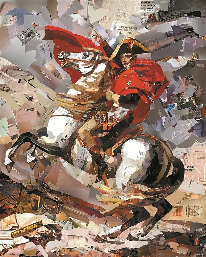 畫家黃鳳榮和他的拼貼名畫《跨越阿爾卑斯山圣伯納隘道的拿破侖》。