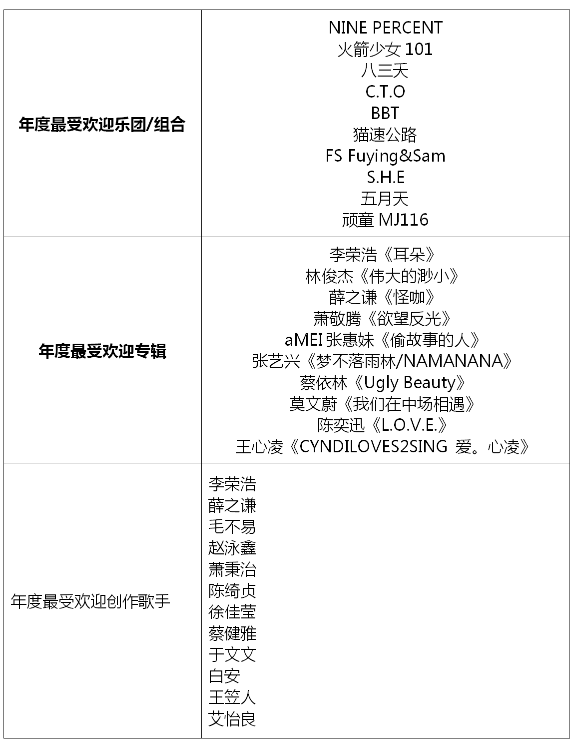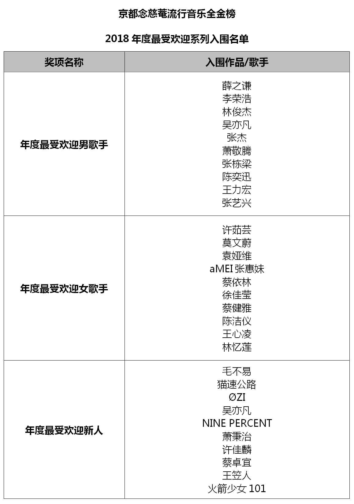 “年度最受歡迎樂(lè)隊(duì)/組合”入圍名單中,同在2018年成功舉辦巡回演唱會(huì)的五月天、S.H.E等老牌組合的進(jìn)榜,讓大家看到了華語(yǔ)樂(lè)壇常青樹的非凡音樂(lè)實(shí)力;八三夭、C.T.O、BBT、FS Fuying&Sam、頑童MJ116等組合,憑借不減反升的人氣魅力實(shí)力進(jìn)榜;而NINE PERCENT、火箭少女101及貓速公路等新人組合的二次入圍,不僅僅是對(duì)他們?cè)谝魳?lè)成績(jī)上的肯定,更是對(duì)其未來(lái)之路的鼓勵(lì)。