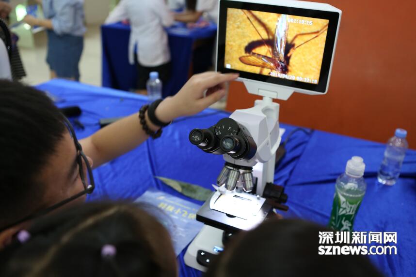 現(xiàn)場(chǎng)孩子們?cè)陲@微鏡下觀察昆蟲(chóng)