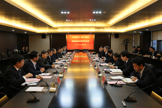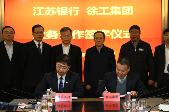 江蘇銀行董事長夏平(左三),徐工集團董事長王民(右三)出席簽約儀式