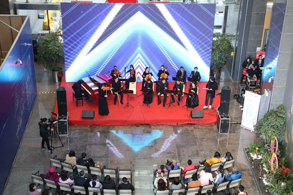琴聲時而舒緩如流泉,時而激越如飛瀑,時而清脆如珠落玉盤,時而低回如呢喃細語……鋼琴與提琴交織,管樂和弦樂共舞,是的,你沒有聽錯,這是古典交響樂在午間響起,在福田CBD,在白領云集的辦公樓,在招商銀行深圳分行大廈的營業(yè)大廳里。2018年2月6日,招商銀行深圳分行大廈迎來了福田愛樂樂團午間音樂會新年的第三場演出,也是該樂團自2015年創(chuàng)辦午間音樂會以來的第84場演出。高雅的藝術氣息讓原本單調的午間趣味橫生,動人的場景、美妙的樂音,在這里一一定格。