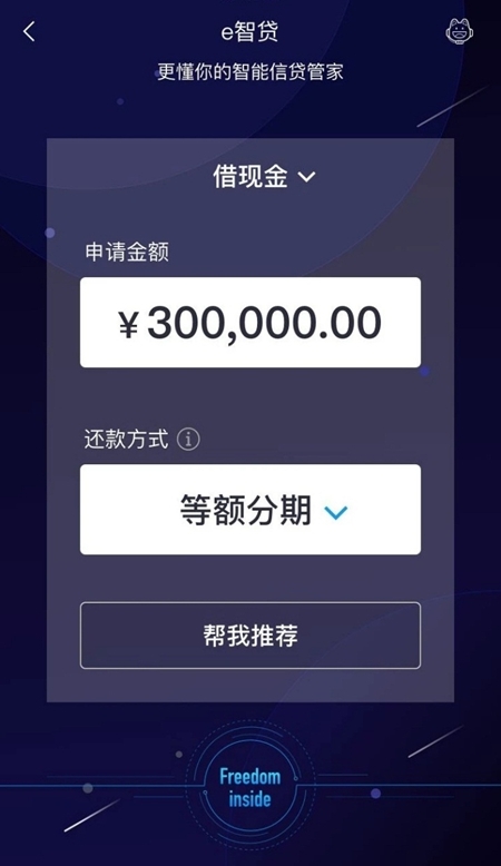 全新升級(jí)Freedom引擎后的e智貸,借助其自身的Freedom核心推薦的強(qiáng)大功能,通過(guò)極速的信息搜集和計(jì)算,可秒級(jí)判斷可貸額度,并為客戶量身推薦e招貸、e閃貸、分期還款等多種產(chǎn)品。
