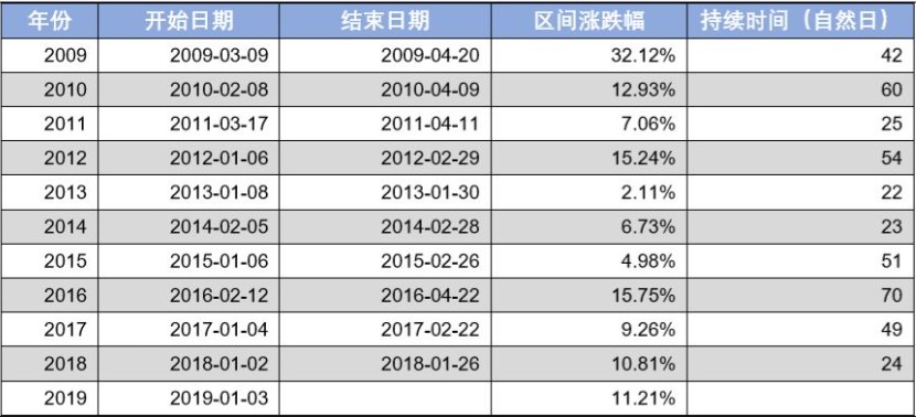 從以上統(tǒng)計數(shù)據(jù)可以明顯看到春季躁動的存在,但是持續(xù)的時間和區(qū)間漲跌幅有明顯的差異,持續(xù)時間最短的是2018年,一共24個自然日,最長的是2016年達到70個自然日。漲幅最小的是2013年,僅僅上漲2.11%,效果最不明顯。