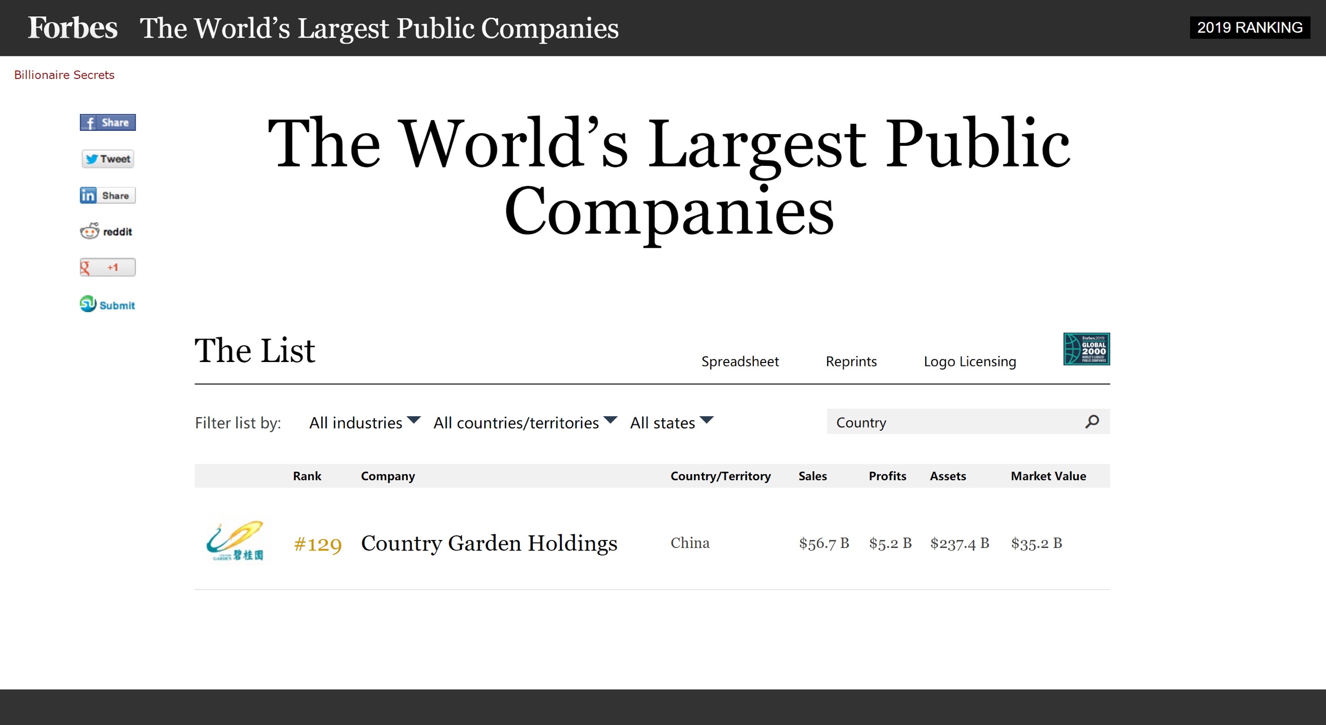 福布斯全球2000強(qiáng)發(fā)榜,309家中企入選,碧桂園位列129名