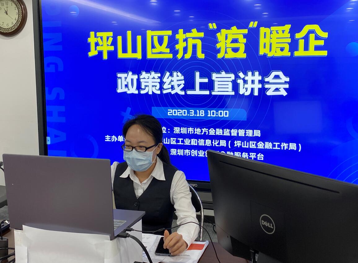為充分支持坪山區(qū)內(nèi)企業(yè)抗擊疫情和復(fù)工復(fù)產(chǎn),攜手企業(yè)共渡難關(guān),2020年3月18日上午,深圳農(nóng)商行坪山支行通過“線上宣講”方式參加了由坪山區(qū)工業(yè)和信息化局聯(lián)合開展的抗“疫”暖企政策宣講和銀企對接系列活動?;顒又校钲谵r(nóng)商行坪山支行為區(qū)內(nèi)100多家企業(yè)詳細(xì)介紹該行在抗疫期間推出的“抗疫周轉(zhuǎn)貸”、“抗疫訂單貸”、“抗疫醫(yī)療貸”等專屬產(chǎn)品,同時也為企業(yè)推薦了“速抵貸”、“速易貸”、“稅e貸”、“通發(fā)貸”等特色產(chǎn)品。