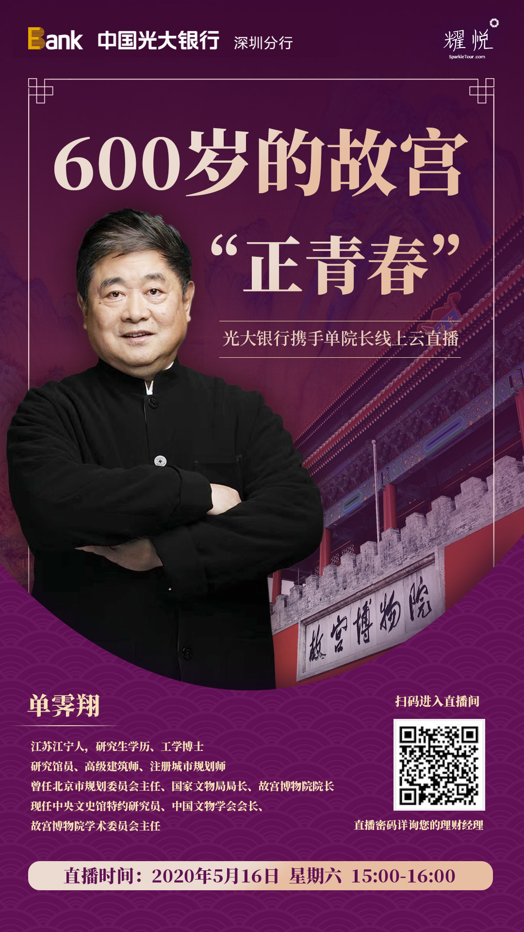 深圳新聞網(wǎng)2020年5月15日訊 他要來了,帶著600歲故宮的青春故事來了,來到《光大銀行“開講啦”!》第十二期。為了回饋客戶,讓廣大客戶更深入體會到故宮之美,光大銀行深圳分行特邀請?jiān)蕦m博物館單霽翔院長,于5月16日(周六)下午3點(diǎn)-4點(diǎn)線上開講精彩課程《600歲的故宮“正青春”》,讓參與者從多個(gè)角度體驗(yàn)傳統(tǒng)文化之美。