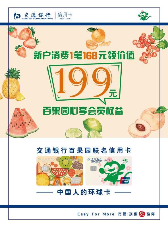 即日起至2020年12月31日,成功核發(fā)指定交通銀行百果園聯(lián)名信用卡主卡的新客戶,自核卡日起45天(含)內(nèi)使用該指定交通銀行信用卡滿足1筆單筆為168元(含)以上的消費(fèi)(不含取現(xiàn)、轉(zhuǎn)賬),即可于核卡日60天內(nèi)(含)至買單吧APP使用5積分換購價(jià)值199元的百果心享會(huì)員權(quán)益。