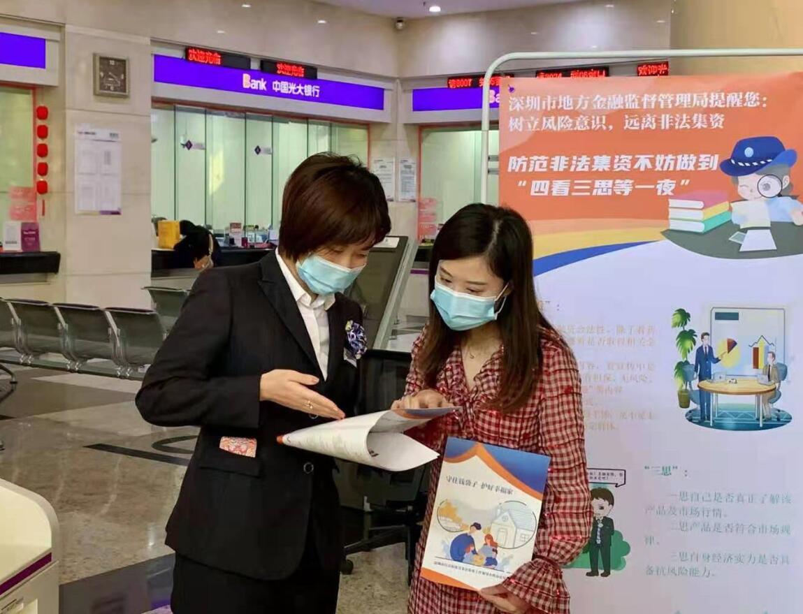 在活動(dòng)開展期間,光大銀行深圳分行在網(wǎng)點(diǎn)擺放了防范非法集資的宣傳展架,并向前來(lái)辦理業(yè)務(wù)的市民主動(dòng)發(fā)放防范非法集資宣傳手冊(cè)。宣傳冊(cè)上詳細(xì)介紹了非法集資相關(guān)的金融知識(shí),包括非法集資的特征、表現(xiàn)形式和常見手段,摘錄了相關(guān)的法律法規(guī)和政策,用非法集資案例生動(dòng)形象的說(shuō)明危險(xiǎn)就在身邊。該行網(wǎng)點(diǎn)員工還針對(duì)客戶提出的疑問(wèn)給予詳細(xì)講解,并提醒客戶,遠(yuǎn)離非法集資,守好自己的“錢袋子”。