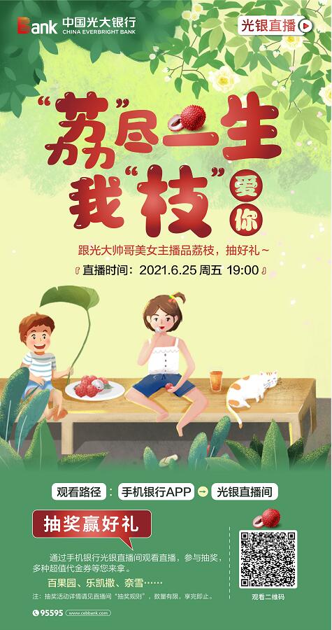 深圳新聞網(wǎng)2021年6月25日訊(記者 朱琳)“日啖荔枝三百顆,不辭長(zhǎng)作嶺南人”“一騎紅塵妃子笑,無人知是荔枝來”……時(shí)逢盛夏,又是品嘗荔枝的最佳時(shí)節(jié)。6月25日19時(shí),光大銀行深圳分行將通過手機(jī)銀行APP“光銀直播”共同開啟荔枝品嘗之“夜”,并送出精美大獎(jiǎng),愛吃荔枝的你一定不要錯(cuò)過。