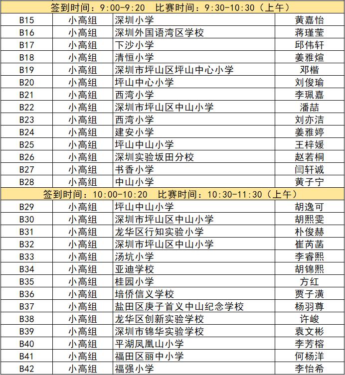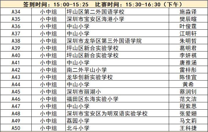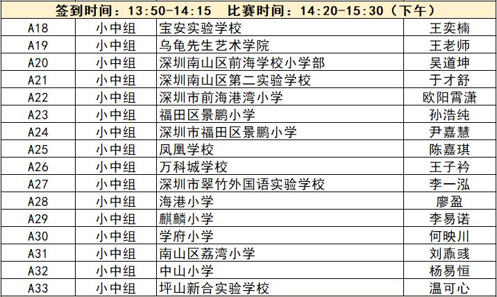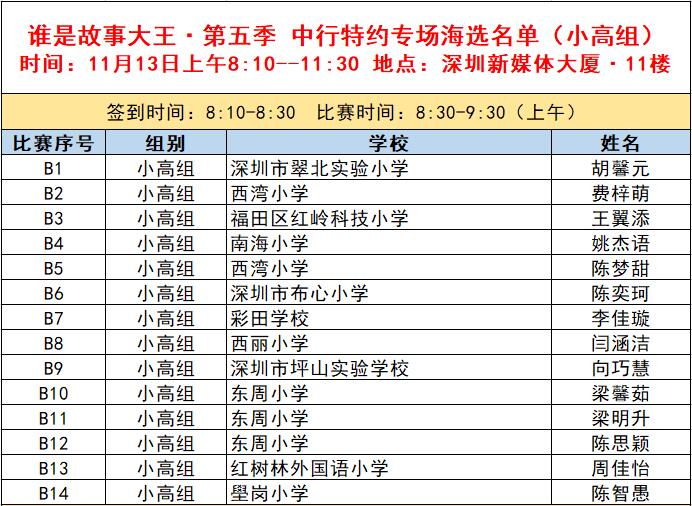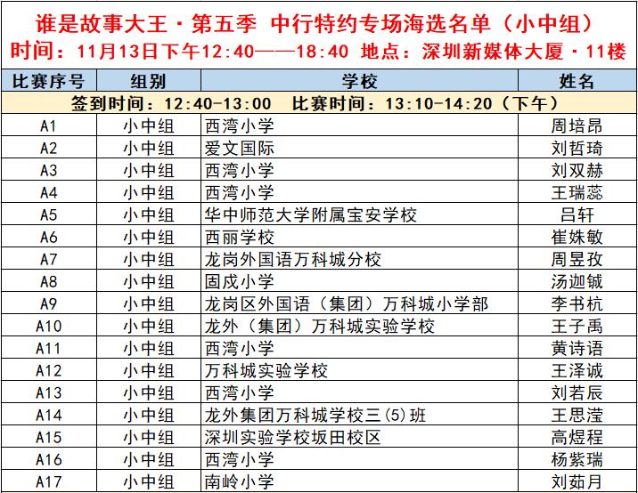 “誰(shuí)是故事大王·第五季”分為小中組和小高組,此次中行特約專(zhuān)場(chǎng)海選報(bào)名的學(xué)生將以脫稿的形式,不限主題,在限時(shí)5分鐘內(nèi),講述積極健康向上的故事。評(píng)委老師們將從四個(gè)維度進(jìn)行評(píng)分,其中內(nèi)容占50%、表現(xiàn)技巧占30%、儀態(tài)占10%,以及時(shí)間掌控、創(chuàng)意特色呈現(xiàn)等占10%。最終,本場(chǎng)活動(dòng)將選拔出部分學(xué)生晉級(jí)“誰(shuí)是故事大王·第五季”深圳市復(fù)賽,他們將和來(lái)自指定校園分賽區(qū)、特約專(zhuān)場(chǎng)以及線(xiàn)上分賽區(qū)的選手一起爭(zhēng)奪深圳市決賽名額?,F(xiàn)將上場(chǎng)順序(即所在小組的序號(hào)順序)、名單、簽到時(shí)間、比賽時(shí)間公布如下:
