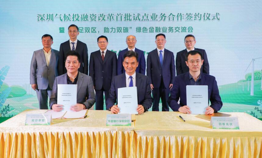 在與會領導嘉賓的共同見證下,華夏銀行深圳分行分別與深圳市創(chuàng)維光伏科技有限公司、深圳市拓日新能源科技股份有限公司簽署了《深圳氣候投融資改革首批試點業(yè)務合作協議》。