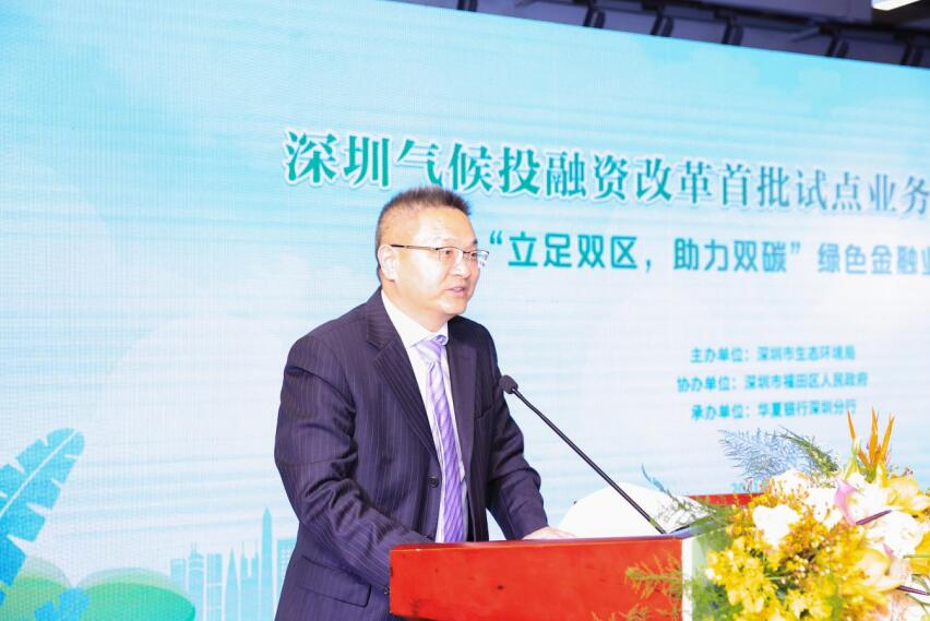國家生態(tài)環(huán)境部氣候司司長李高,深圳市政府副秘書長劉昂,深圳市生態(tài)環(huán)境局局長李水生,深圳市委改革辦副主任孫華明,福田區(qū)政府副區(qū)長朱江,華夏銀行總行黨委委員、營銷總監(jiān)、深圳分行黨委書記、行長陳傳龍等領導出席。深圳市政府、深圳市生態(tài)環(huán)境局、市委改革辦、中國人民銀行深圳市中心支行、福田區(qū)政府相關負責人、深圳市綠色企業(yè)代表、深圳市綠色相關行業(yè)協會代表、華夏銀行深圳分行相關單位代表等70余人參加活動。