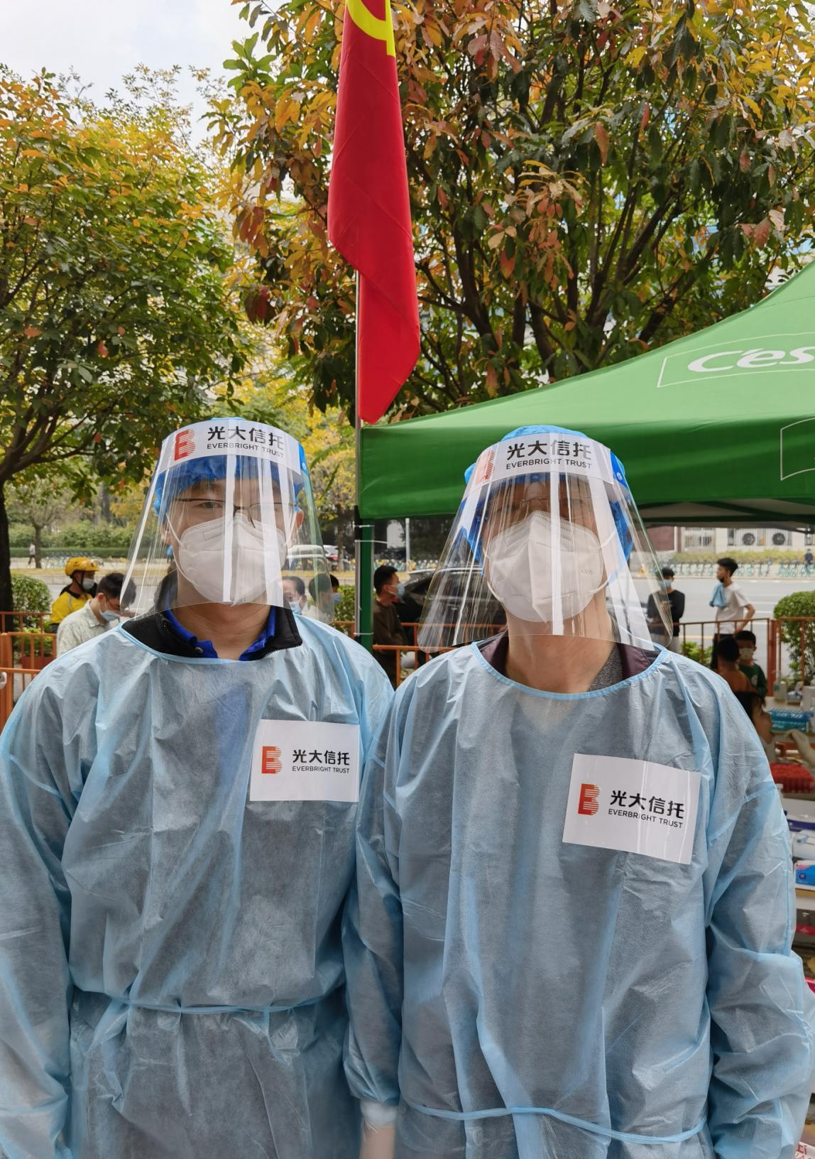 光大信托深圳區(qū)域黨支部在接到協(xié)同抗疫通知后,第一時(shí)間組織黨員和員工積極報(bào)名參與志愿服務(wù)。3月5日,恰逢毛澤東主席“向雷鋒同志學(xué)習(xí)”題詞的紀(jì)念日,光大信托公司風(fēng)險(xiǎn)總監(jiān)姚恒民同志以年近6旬的高齡,率先垂范的沖在一線,帶領(lǐng)深圳區(qū)域黨員同志們,投入福田區(qū)蓮花街道獅嶺社區(qū)的核酸檢測(cè)志愿服務(wù)工作,用實(shí)際行動(dòng)和赤誠(chéng)情懷書寫共產(chǎn)黨員的責(zé)任和擔(dān)當(dāng)。當(dāng)天天氣炎熱,太陽(yáng)暴曬下穿著防護(hù)服兩個(gè)小時(shí)工作下來,全身已完全濕透,但他們以飽滿的激情、負(fù)責(zé)任的態(tài)度詮釋了一個(gè)共產(chǎn)黨員在黨旗下宣誓的誓言。光大信托的一位黨員同志說:“疫情就是命令,防控就是責(zé)任,崗位就是戰(zhàn)場(chǎng),每個(gè)服務(wù)點(diǎn)的黨旗就是一種信仰,每個(gè)黨員就是一面旗幟,每個(gè)黨支部就是一個(gè)堡壘,哪里有需要,哪里就有光大人的身影?!?/p>