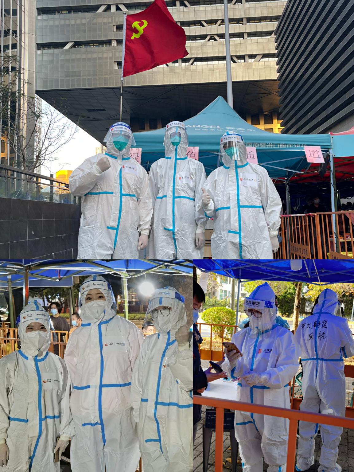 在疫情防控的關(guān)鍵時(shí)期,深圳分行黨委堅(jiān)決貫徹落實(shí)當(dāng)?shù)卣姆揽匾?,分行黨委書記、行長(zhǎng)韓學(xué)智同志緊急召開黨委會(huì)議,啟動(dòng)應(yīng)急預(yù)案,積極部署并投入疫情防控工作,確保日常營(yíng)運(yùn)和客戶服務(wù)等工作有序運(yùn)轉(zhuǎn)。在深圳福田區(qū)金融工作局的組織與號(hào)召下,分行黨委要求全體黨員干部發(fā)揮先鋒模范作用,主動(dòng)為社區(qū)疫情防控工作提供志愿服務(wù)。分行黨委委員們率先垂范,分頭帶領(lǐng)黨員干部奔赴社區(qū)慰問抗戰(zhàn)一線工作人員,并犧牲周末休息時(shí)間深入社區(qū)核酸采樣點(diǎn),脫下西裝變身“大白”。深圳分行各黨支部和團(tuán)支部先后組織開展各類志愿服務(wù)累計(jì)時(shí)長(zhǎng)超過100小時(shí),活躍在防疫抗疫一線的同志們?cè)谌ΡU蠌V大群眾金融服務(wù)需求的同時(shí),和醫(yī)護(hù)工作者一同守護(hù)著千家萬戶。作為集團(tuán)駐深企業(yè)協(xié)同工作的牽頭單位,分行牽頭組建駐深企業(yè)志愿者先鋒隊(duì),緊急投身福田區(qū)抗擊疫情的各個(gè)戰(zhàn)線和各個(gè)角落,不分晝夜、不論疲倦、以實(shí)際行動(dòng)踐行初心、使命和擔(dān)當(dāng),弘揚(yáng)新時(shí)代共產(chǎn)黨人的奉獻(xiàn)精神?!叭绻皇怯H身體驗(yàn)志愿者服務(wù)工作,永遠(yuǎn)不知道抗疫人員的工作是如此辛苦!有多少人在負(fù)重前行才確保了深圳市民有序和安寧的生活。此刻很想擁抱可親可敬的你們,防護(hù)服雖然阻擋了我們的擁抱,但無法阻擋我們一起抗擊疫情的心?!币晃恢驹刚哌@樣記錄到。