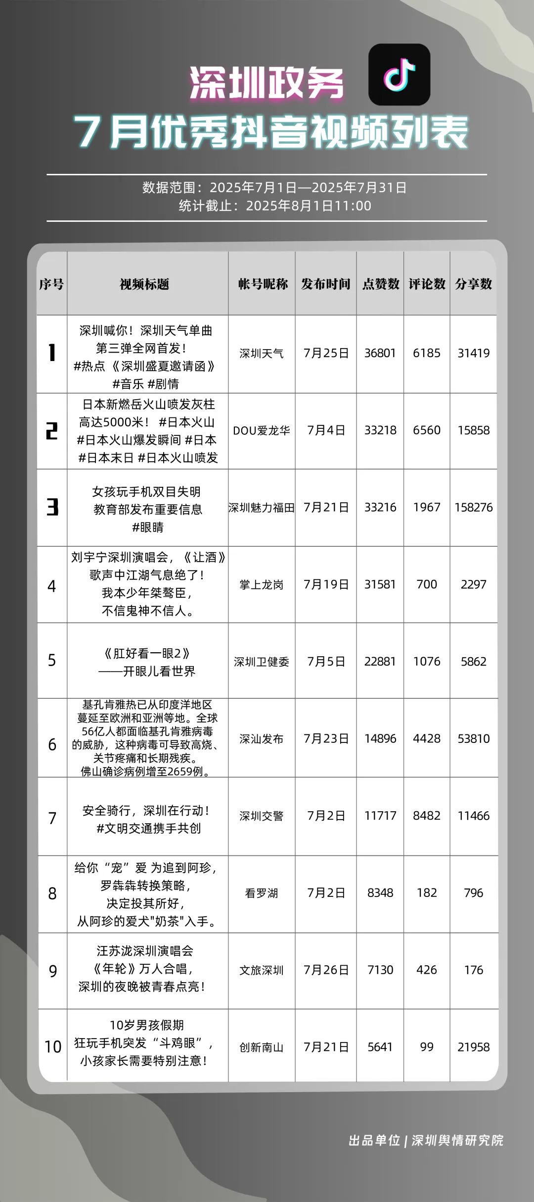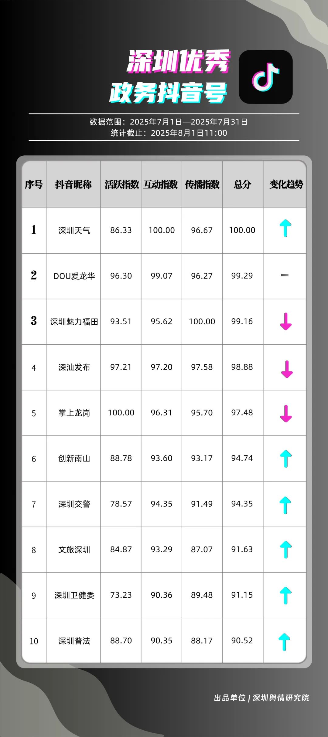 7月,“深圳天氣”“DOU愛(ài)龍華”“深圳魅力福田”“深汕發(fā)布”“掌上龍崗”“創(chuàng)新南山”“深圳交警”“文旅深圳”“深圳衛(wèi)健委”“深圳普法”共10個(gè)政務(wù)抖音號(hào)獲得“優(yōu)秀政務(wù)抖音號(hào)”稱號(hào)。其中,“深圳天氣”互動(dòng)指標(biāo)獲滿分,憑借氣象與趣味相結(jié)合的創(chuàng)新科普形式,領(lǐng)跑優(yōu)秀政務(wù)抖音號(hào);“DOU愛(ài)龍華”“深圳魅力福田”分別位列第二、三名,通過(guò)聚焦網(wǎng)絡(luò)熱點(diǎn)、挖掘創(chuàng)意內(nèi)容,不斷提升傳播效能,展現(xiàn)出強(qiáng)大的政務(wù)新媒體影響力;“深汕發(fā)布”“掌上龍崗”“創(chuàng)新南山”等賬號(hào)緊隨其后,上榜的優(yōu)質(zhì)政務(wù)抖音號(hào)用短視頻語(yǔ)言強(qiáng)化傳播效果,展現(xiàn)了鮮明的賬號(hào)特色和風(fēng)采。