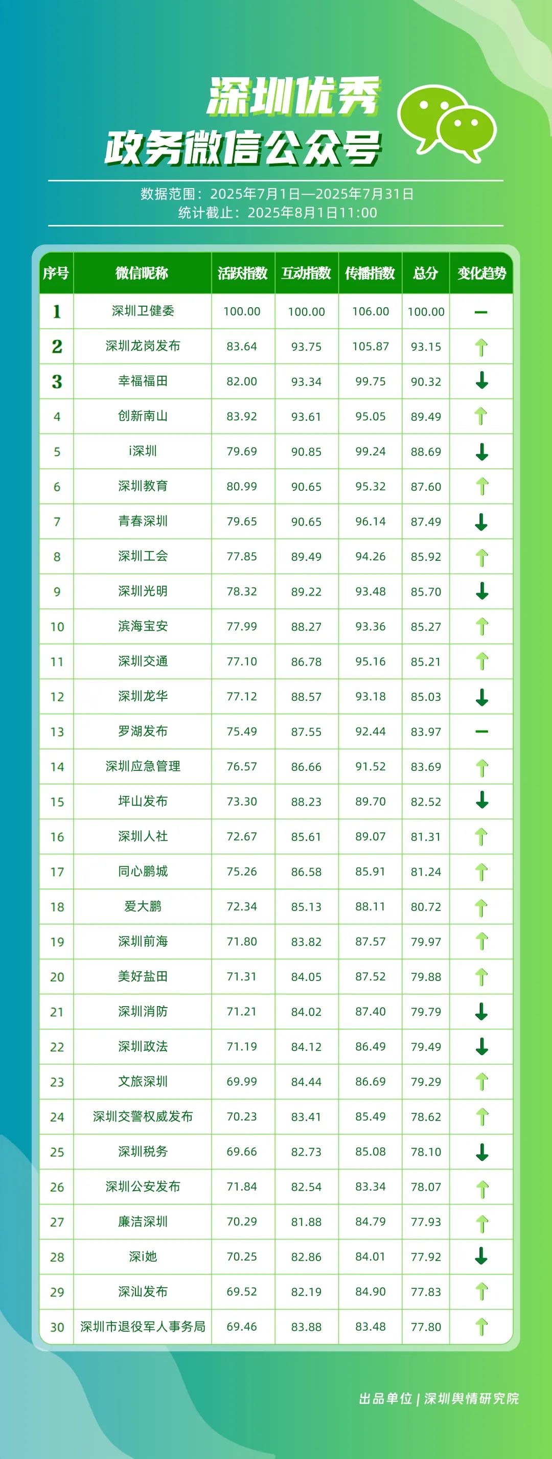 7月,30個(gè)政務(wù)微信公眾號(hào)入選“深圳優(yōu)秀政務(wù)微信公眾號(hào)”榜單,其中包括“深圳衛(wèi)健委”“深圳龍崗發(fā)布”“幸福福田”“創(chuàng)新南山”“i深圳”“深圳教育”“青春深圳”“深圳工會(huì)”“深圳光明”“濱海寶安”等。7月,“深圳衛(wèi)健委”內(nèi)容專業(yè)性與傳播力優(yōu)勢(shì)穩(wěn)固,整體表現(xiàn)保持較高水平,位于榜首;“深圳龍崗發(fā)布”聚焦民生服務(wù)與區(qū)域活動(dòng)宣傳,實(shí)現(xiàn)傳播效果提升,位居第二;“幸福福田”表現(xiàn)同樣不俗,排名第三。“創(chuàng)新南山”“深圳教育”“深圳工會(huì)”等也積極發(fā)布高質(zhì)量信息與服務(wù)內(nèi)容,能夠較好平衡內(nèi)容“質(zhì)”與“量”,排名有所提升。上榜微信公眾號(hào)依托特色優(yōu)勢(shì)深耕內(nèi)容創(chuàng)作,將優(yōu)質(zhì)內(nèi)容作為核心支撐,成為政務(wù)傳播領(lǐng)域的優(yōu)秀典范。