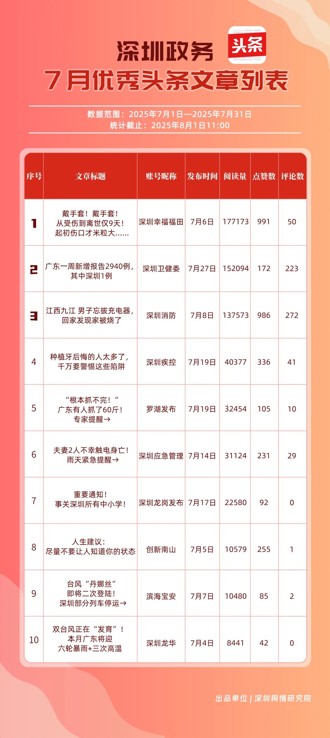 7月,“深圳幸福福田”“深圳消防”“深圳衛(wèi)健委”“深圳疾控”“創(chuàng)新南山”“羅湖發(fā)布”“深圳應(yīng)急管理”“濱海寶安”“深圳龍崗發(fā)布”“坪山發(fā)布”共10個(gè)政務(wù)頭條號(hào)入選“優(yōu)秀政務(wù)頭條號(hào)”榜單。“深圳幸福福田”“深圳消防”憑借優(yōu)質(zhì)內(nèi)容持續(xù)吸引用戶關(guān)注,穩(wěn)居前二;“深圳衛(wèi)健委”表現(xiàn)亮眼,評(píng)分達(dá)92.68分,排名較6月有所上升;“深圳疾控”同樣進(jìn)步明顯,在疾病預(yù)防控制信息傳播上發(fā)揮了重要作用?!皠?chuàng)新南山”“羅湖發(fā)布”“深圳應(yīng)急管理”等上榜賬號(hào),也各展所長(zhǎng),始終將優(yōu)質(zhì)內(nèi)容作為核心抓手,成為政務(wù)新媒體領(lǐng)域內(nèi)容創(chuàng)作與傳播的典范。