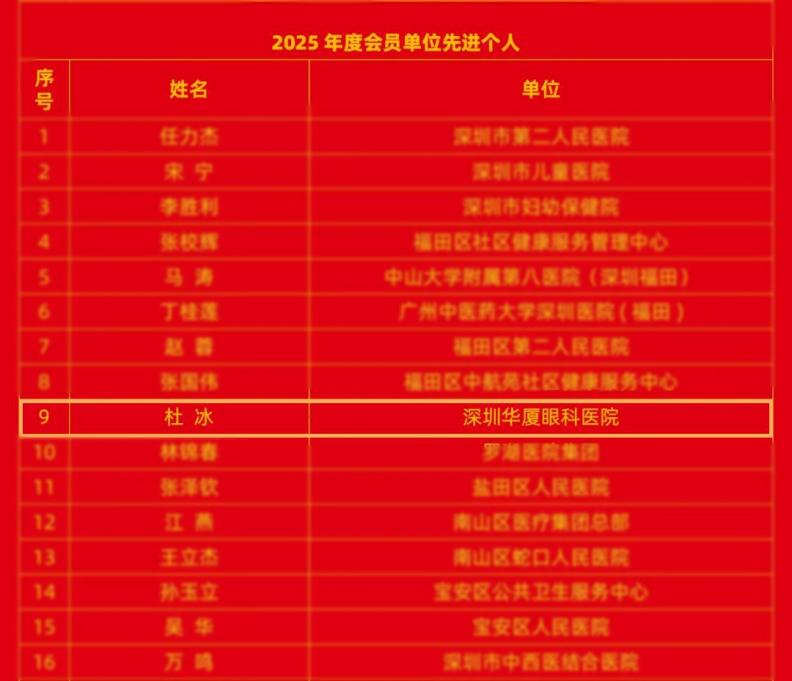 深圳華廈眼科醫(yī)院杜冰獲評市社區(qū)衛(wèi)生協(xié)會“2025年度會員單位先進個人”稱號