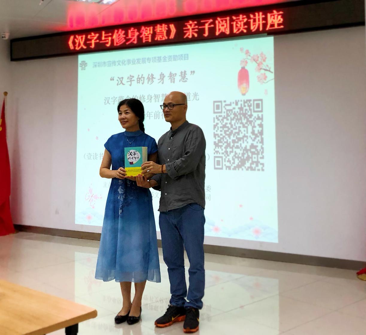 講座在親子之間、講者與聽眾之間充滿趣味性的互動中接近尾聲,劉建彪先生向龍湖社區(qū)黨群服務中心圖書館贈送《漢字與修身智慧》書籍,希望更多的青少年用心感受中華優(yōu)秀傳統(tǒng)文化之美。