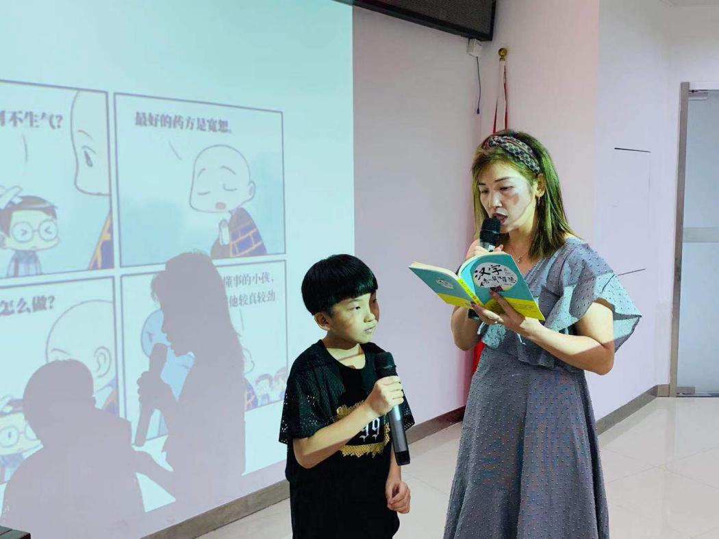 現(xiàn)場親子通過修身口訣總體把握了書籍所選的三十六個漢字,也初步體會到漢字蘊含的修身智慧。接著,在主講人的邀請下,參加活動的親子一一上臺,對照書中的漢字漫畫進行角色扮演,展開親子對話的同時身臨其境感受漢字的哲思性。每一位小朋友上臺展演,或活潑開朗、充滿自信地配合家長完成對話,或羞怯地在現(xiàn)場聽眾的掌聲鼓勵下突破自己。