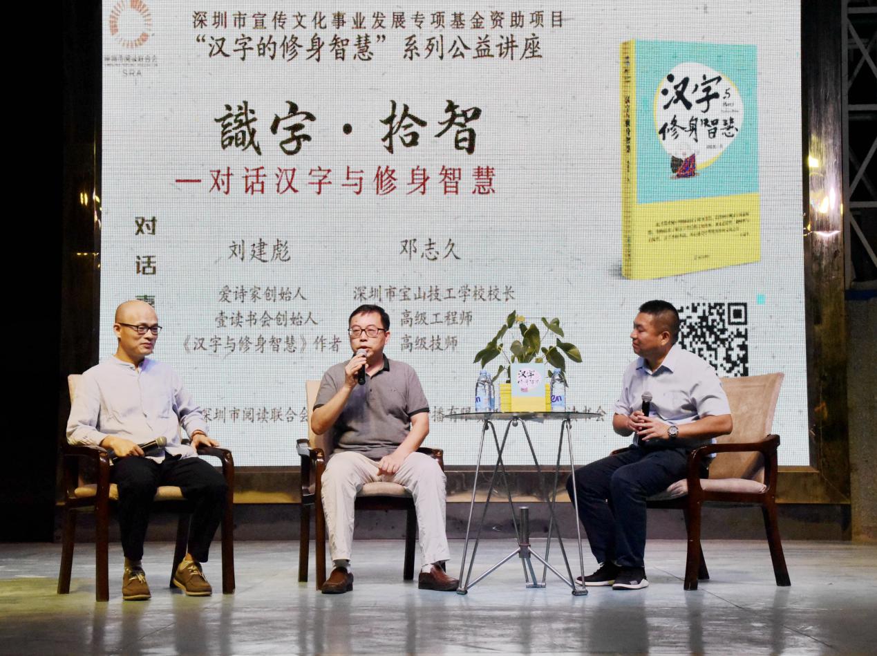 深圳新聞網(wǎng)訊 9月18日晚上7時(shí),由深圳市閱讀聯(lián)合會(huì)、深圳市壹書文化傳播有限責(zé)任公司和寶山讀書會(huì)共同主辦的“‘識(shí)字拾智’——對(duì)話漢字與修身智慧”公益文化講座在寶山技工學(xué)校寶山大舞臺(tái)拉開(kāi)了序幕。據(jù)悉,這是由深圳市宣傳文化事業(yè)發(fā)展專項(xiàng)基金資助項(xiàng)目“漢字的修身智慧”的第三場(chǎng)公益文化講座,以劉建彪《漢字與修身智慧》新書分享為契機(jī),傳播漢字正能量,讓更多的青少年識(shí)字長(zhǎng)智,領(lǐng)略漢字文化之精妙。