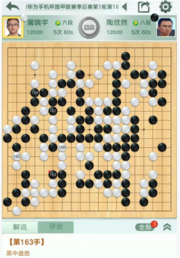 第四臺(tái)慢棋,由深圳隊(duì)陶欣然八段執(zhí)黑對(duì)陣民生隊(duì)的屠曉宇六段。開局雙方互圍大模樣。白棋右邊在黑空試應(yīng)手時(shí)黑方強(qiáng)烈反擊。白棋沒(méi)有下出做活的手段,不得不付出很大代價(jià)出頭跑出,黑優(yōu)勢(shì)。之后中央白棋混戰(zhàn)中戰(zhàn)略方向錯(cuò)誤,黑棋優(yōu)勢(shì)擴(kuò)大。最后黑棋在左邊白棋空里薄弱處出棋,一舉獲勝。陶欣然執(zhí)黑中盤勝屠曉宇。