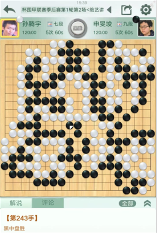 慢棋第三臺由深圳隊的外援申旻埈九段執(zhí)黑對陣民生隊的孫騰宇七段。中盤白棋上方和中央聯(lián)系失誤,黑棋領(lǐng)先。黑棋對中央白棋大龍和左下白棋大龍展開纏繞攻擊,最后穩(wěn)健的讓白棋做活進入官子。最終黑棋以3/4子的最小差距獲勝,申旻埈3/4子勝孫騰宇。