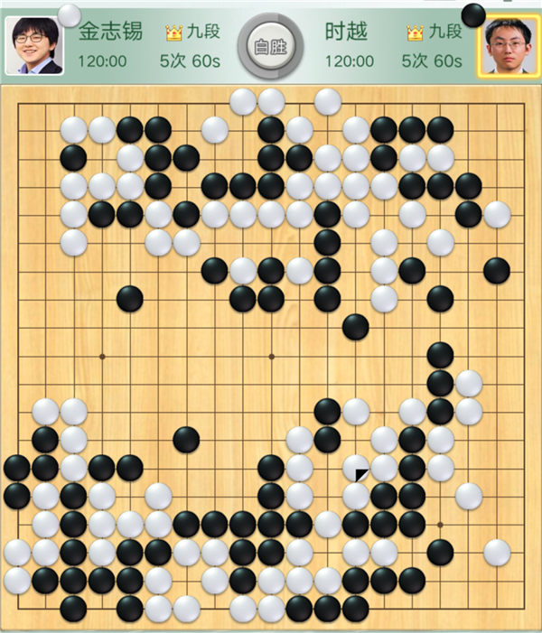 緊接著,時(shí)越執(zhí)黑對陣金志錫一局傳來告負(fù)的消息。縱觀全局,開局時(shí)黑稍好,但中盤攻擊上邊白棋時(shí)候方向錯(cuò)誤,被白棋聯(lián)絡(luò)后自身還留下了白棋開劫的隱患。之后黑棋在劫爭中放棄上方黑子在下邊圍出大模樣爭勝。白棋在黑勢中施展手段時(shí)黑棋必需尋求凈殺白子。無奈周邊不夠厚實(shí)殺不掉,遂于174手時(shí)認(rèn)負(fù)。