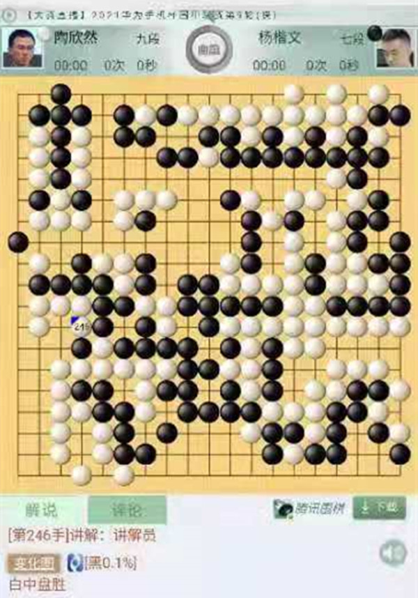 三臺陶欣然執(zhí)白對陣等級分排名29位的楊楷文。開局右邊黑棋沖擊白棋將白分?jǐn)?,但是由于棋形沒有下對,反而用來斷開白棋的棋筋被吃,白棋早早進(jìn)入勝勢。這一盤是此輪深圳龍華隊唯一勝局,不易!為陶欣然點(diǎn)贊!
