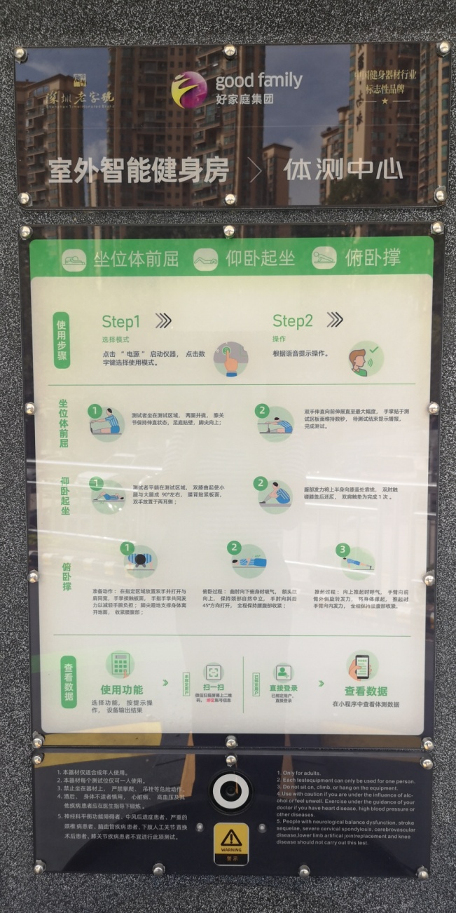 從寶安大道走進(jìn)寶安體育館,沿著裕安一路,在碩大的“室外智能健身設(shè)施”的指引牌下,我們看到了一線極具科技感的健身設(shè)施。這些設(shè)施采用不測試不訓(xùn)練的理念,通過科學(xué)健身運動方式,涵蓋從體質(zhì)測定到有氧訓(xùn)練、力量訓(xùn)練等訓(xùn)練內(nèi)容,利用智能化系統(tǒng)形成評估報告,出具運動報告。通過這套設(shè)備,市民不但可測試訓(xùn)練,遠(yuǎn)程進(jìn)行線上比賽。同時,配套的系列服務(wù),還可提升市民對身體、健康運動、健康飲食的認(rèn)識。