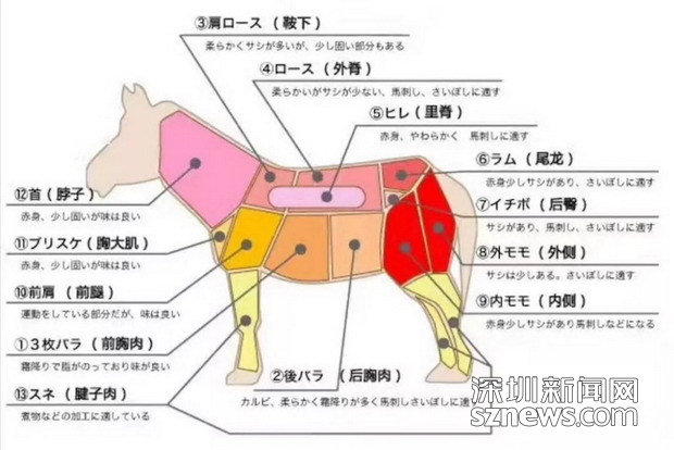 馬能做成刺身的部位相當(dāng)?shù)挠邢蓿勒沼突ǚ植即笾驴梢苑譃楦谷?卜口)、霜降、赤身等不同的等級。其中最稀有的的“三枚腹”肉,一匹五百公斤的馬只能產(chǎn)出大約5-6公斤,肉質(zhì)口感近似于藍(lán)鰭金槍魚中腹肉。