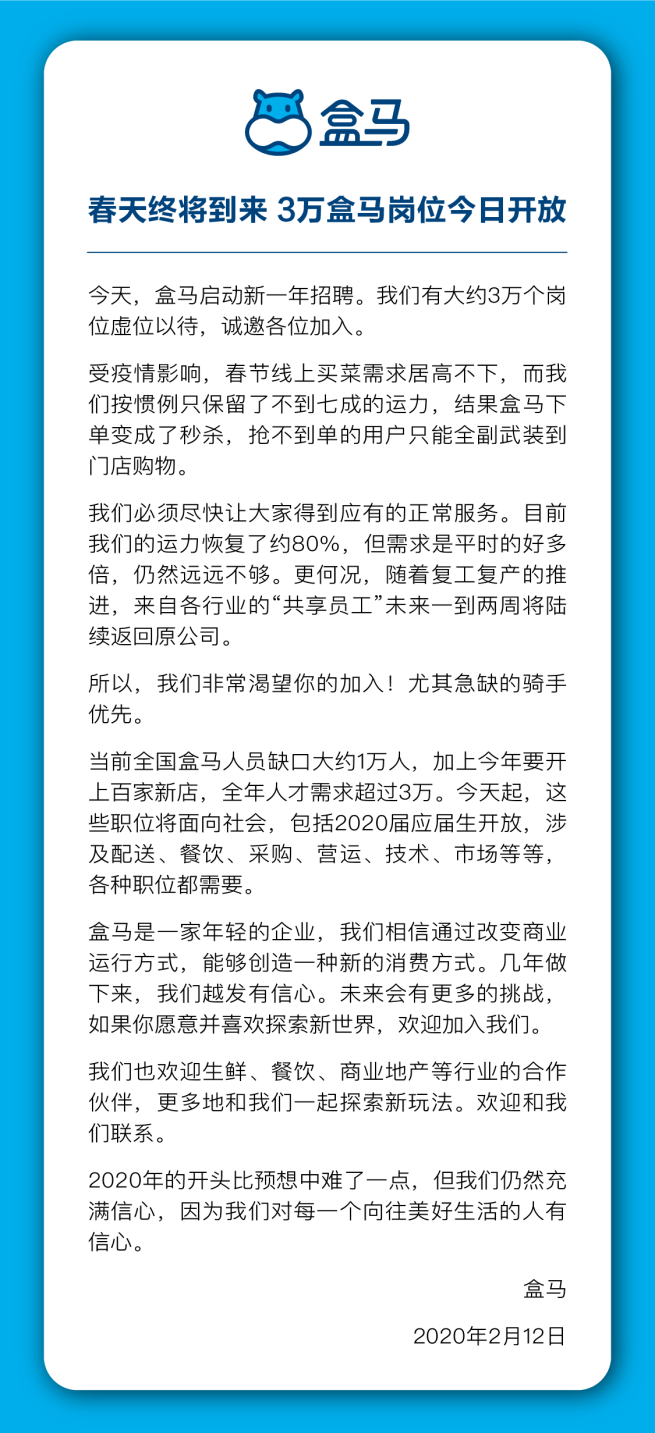 見圳客戶端·深圳新聞網(wǎng)2020年2月12日訊 2月12日,盒馬宣布開啟新一輪招聘,開放3萬(wàn)個(gè)崗位,包括總部采購(gòu)、技術(shù)、運(yùn)營(yíng)等,也包括一線門店小二,其中配送小哥最為緊急。