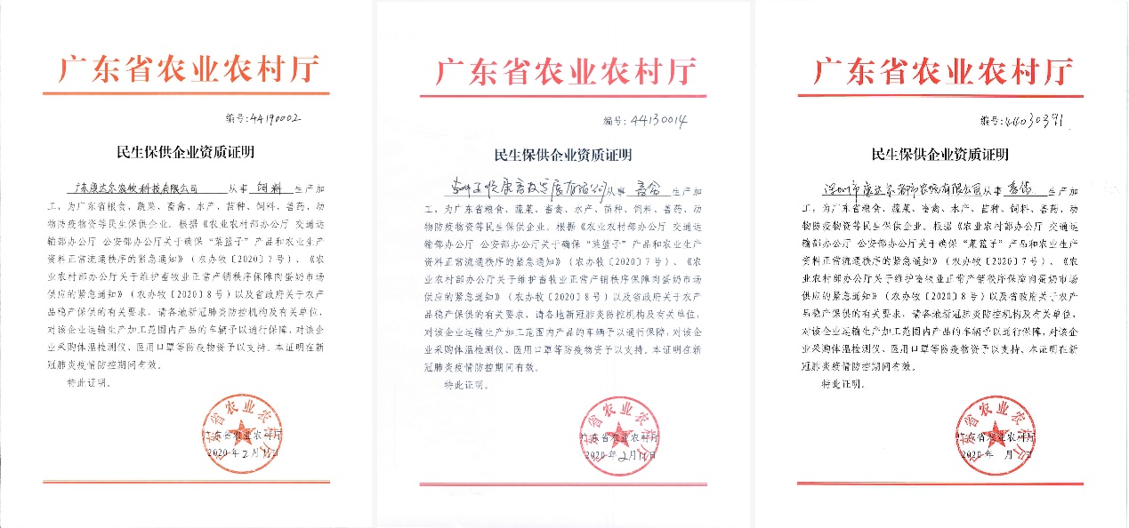 見圳客戶端·深圳新聞網(wǎng)2020年2月13日訊  農(nóng)產(chǎn)品是群眾生活必需品,農(nóng)業(yè)生產(chǎn)資料是農(nóng)業(yè)生產(chǎn)的必需物資。2020年2月11日-12日,康達(dá)爾集團(tuán)農(nóng)業(yè)板塊三大公司廣東康達(dá)爾農(nóng)牧科技有限公司、惠州正順康畜牧發(fā)展有限公司、深圳市康達(dá)爾都市農(nóng)場有限公司先后獲批“民生保供企業(yè)”資質(zhì)證明,這將非常有利于各企業(yè)開展農(nóng)產(chǎn)品和農(nóng)業(yè)生產(chǎn)資料的保供工作,也意味著康達(dá)爾集團(tuán)在這場防疫保供攻堅戰(zhàn)中所發(fā)揮的作用獲得了高度的肯定。