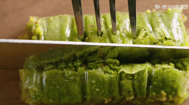 奶酪加滿(mǎn)滿(mǎn)的開(kāi)心果碎,上下覆蓋二十層薄如蟬翼的面皮,小伙子苦苦練習(xí)七年搟面皮,十幾張面皮同時(shí)搟壓,每張的厚度不超過(guò)0.1毫米,