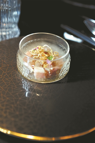 煙焯,當(dāng)廚者將眼前的玻璃罩打開時,撲鼻而來的是蘋果木的煙熏香氣,閉目吸了一口氣,爾后才動勺。先將其中的金槍魚tata與炸過的洋蔥和檸檬葉絲等輕輕攪拌,然后開吃。據(jù)主理人彪哥介紹,撈起是順德魚生的吃飯演變而來,金槍魚tata是日式元素,煙熏是西餐中常用的技法。
