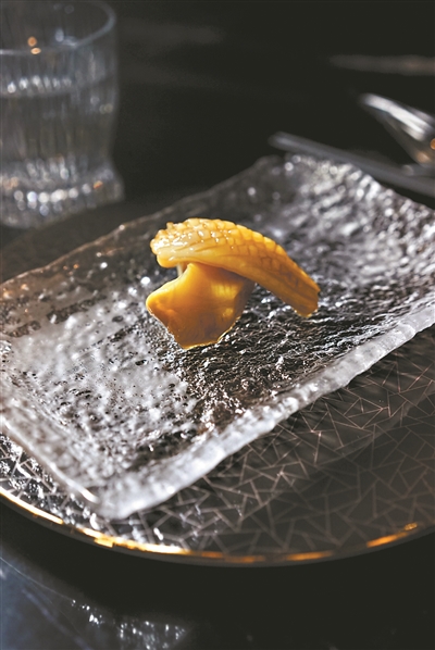 湯焯乃雞油焯響螺。1斤1只的響螺去殼與頭后,凈肉僅僅2兩。切成片狀的響螺經(jīng)過定時低溫慢煮后,淋上剛剛滾起的熱雞油,上碟時,它旁邊跟著一灘其貌不揚的醬汁,那便是紫蘇醬。響螺配紫蘇,勾起人們對中秋的紫蘇炒田螺的味覺記憶。油焯的風(fēng)味靈感源自蒜香骨這道傳統(tǒng)粵菜,取蒜香味結(jié)合魚露醬,融入花膠天婦羅之中。將花膠以天婦羅的方式展現(xiàn),這也是大膽的嘗試。味焯的做法則讓人更熟悉,立馬想起前些年風(fēng)靡廣州的鹵水火鍋來。獅頭鵝的鵝肝在鹵水里泡著溫泉,時間一到才起身,并不太咸,香濃恰好。還有汽焯,是用最當(dāng)造的大黃花魚,將整個迷你小蒸籠搬到面前來,現(xiàn)蒸現(xiàn)吃,7分鐘,嫩度正好?;痨虅t是燒烤澳大利亞和牛肉的燒烤方式,這最原始的烹飪方式里夾著迷迭香和百里香的誘人香氣。而這每一道菜肴,僅僅數(shù)口的分量,道道位上,分量恰到好處,避免了餐桌上的浪費。