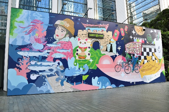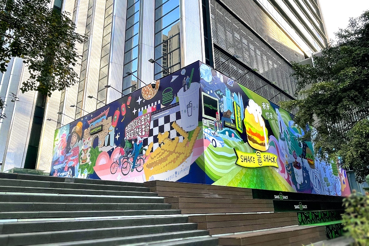 Shake Shack一直熱衷于將品牌文化、潮流趨勢與當?shù)厣罘绞较嗳诤希瑸槠放茙砣蚂`感。作為深圳首店正式開業(yè)前的預告,Shake Shack攜手深圳先鋒藝術家李昱昱 ? (Y oyo L ee )在深圳萬象天地特別推出了別具匠心且富有致敬意義的巨幅創(chuàng)意圍擋。