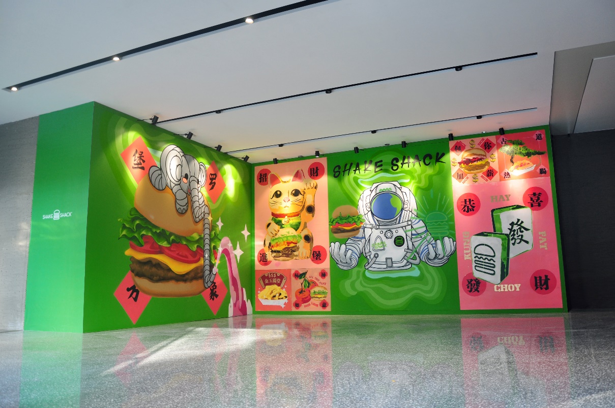 圍擋的室內(nèi)部分采用創(chuàng)新的互動形式,由藝術家現(xiàn)場親自手繪完成的8幅單元涂鴉畫板組合而成。藝術家用摩登時尚的波譜藝術,向當?shù)刭e客們奉送出中國傳統(tǒng)的祝福及Shake Shack的活力熱情。