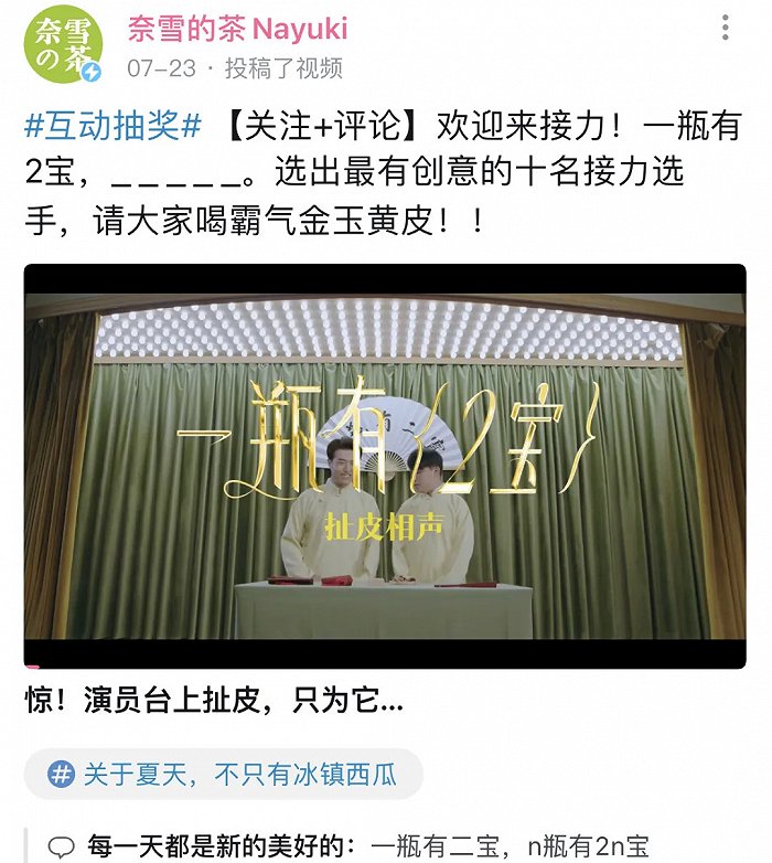 在此之前,奈雪曾用“說(shuō)相聲”的方式推霸氣金玉黃皮,讓茶飲和相聲組CP;霸氣生椰斑斕上架時(shí),他們出了個(gè)東南亞風(fēng)滿滿的視頻,仿佛一秒到了泰國(guó),創(chuàng)意有趣的同時(shí),也讓消費(fèi)者對(duì)產(chǎn)品留下深刻印象。