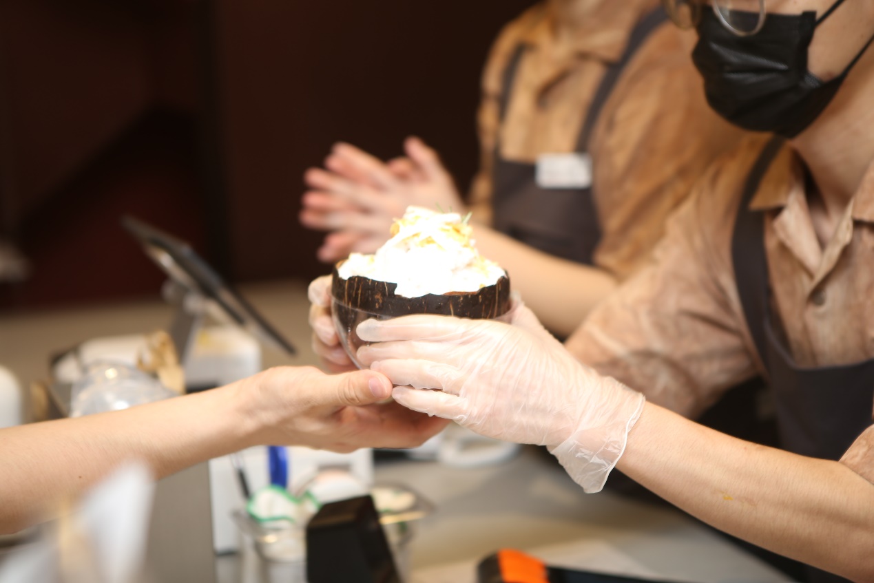 一次性提供如此豐富的手造新品,既是喜茶產(chǎn)品研發(fā)能力的集中體現(xiàn),又是為顧客奉上的極致體驗。記者在現(xiàn)場看到,10點正式營業(yè)后,在一樓點單區(qū),店員們開始耐心地向顧客進行新品介紹和推薦。一些顧客則留意到正在進行的現(xiàn)場炒冰,“剛剛做的那份是什么?我就要那個!”而二層供應(yīng)的“實在整顆生椰”,也讓不少顧客愛不釋手。