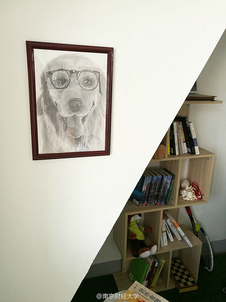 墻上一幅戴著眼鏡的小狗素描圖格外引人注目,它是由602舍長(zhǎng)涂貴平親手畫的?!斑@幅畫還是去年自己參加了一個(gè)帶有公益性質(zhì)的畫畫班學(xué)的,我也沒想到能畫成這樣?!眮碜再F州的涂貴平害羞地說,其實(shí)裝飾寢室的初衷很簡(jiǎn)單,錢就花了300塊不到,主要是希望大學(xué)四年能住在干凈的環(huán)境。