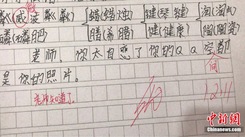 近日,貴州省谷隴翁板小學(xué)的語文老師張沁文,曬出了學(xué)生寫在作業(yè)里的“金句”?!袄蠋煟闾詰倭?,QQ空間都是自己照片”;“顏值升高才有人喜歡您”……孩子們的童言無忌令人哭笑不得,老師的評論也很亮眼。