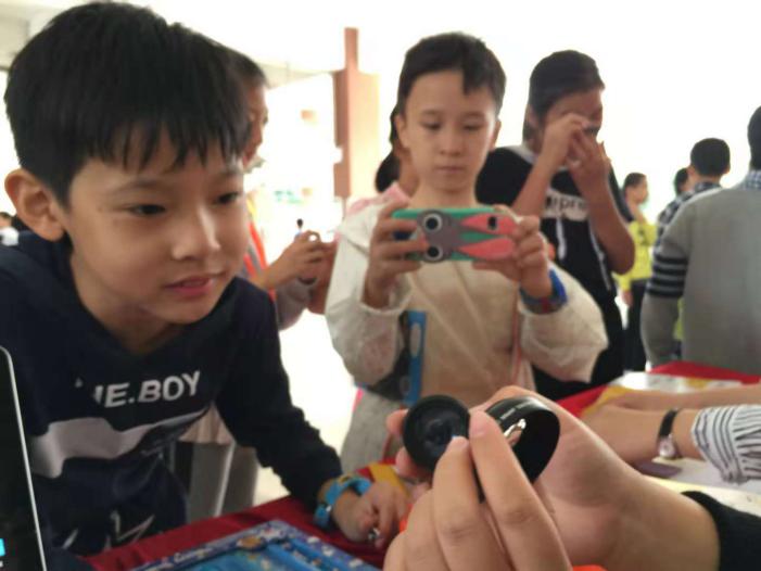 科普益智互動游戲精彩紛呈,深圳阿卡索資訊股份有限公司的華容道大闖關(guān)、筷子夾彈珠互動游戲極大激發(fā)了同學們的參與熱情。深圳市夢飛翔文化傳播有限公司及深圳諾必達節(jié)能環(huán)保有限公司的智能陪伴機器人能詩歌能朗誦,“通今博古”能答疑解惑,成為同學們的良師益友。各種技能培訓在其中兩家學校同步開展,包括中廣和(深圳)科技有限公司的兒童護理實用技能、深圳光影教育投資有限公司的手機和單反使用講座、深圳市海文深生物科技有限公司的牙膏制作工藝展示等項目,讓孩子們收獲不少生活技能。